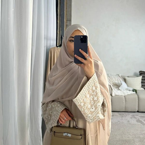 Designed for those who appreciate intricate craftsmanship, this abaya features exquisite hand-embroidered floral patterns on the wide, flowing sleeves.