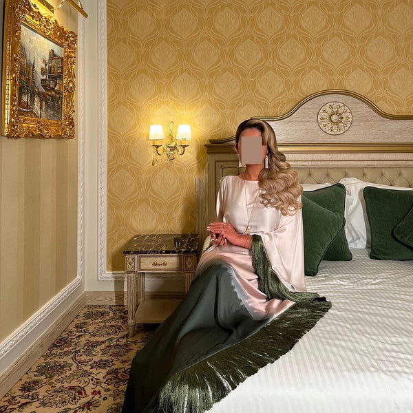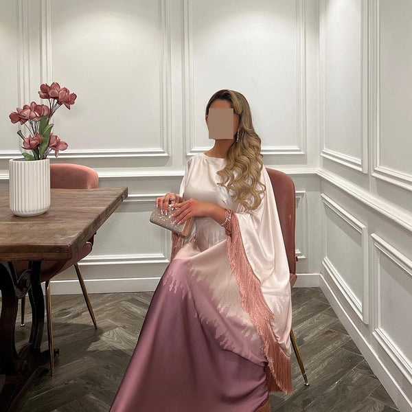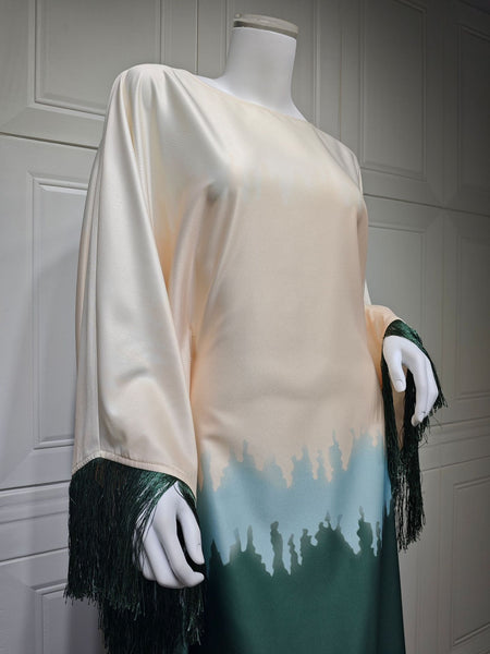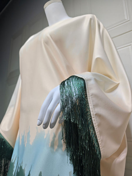 Indulge in luxury with our Ombre Fringed Kaftan, a timeless piece designed for elegance and sophistication. Crafted from premium silk-satin fabric, this kaftan drapes effortlessly, offering a flowing and graceful silhouette. The ombre gradient at the hem creates a mesmerizing effect, available in two stunning shades: