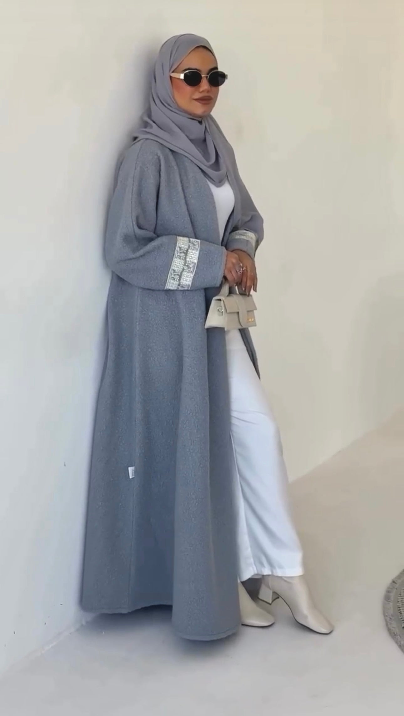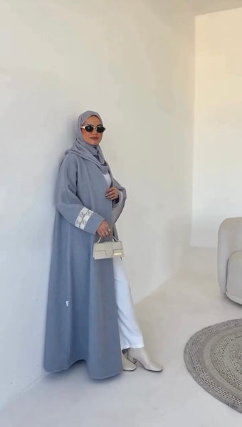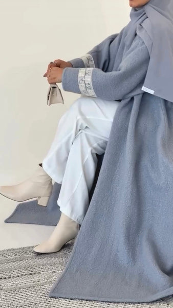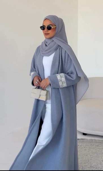 Stay warm and stylish this winter with our Cozy Blue Woolen Abaya Set.
