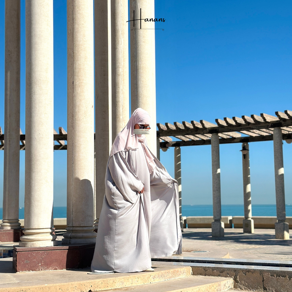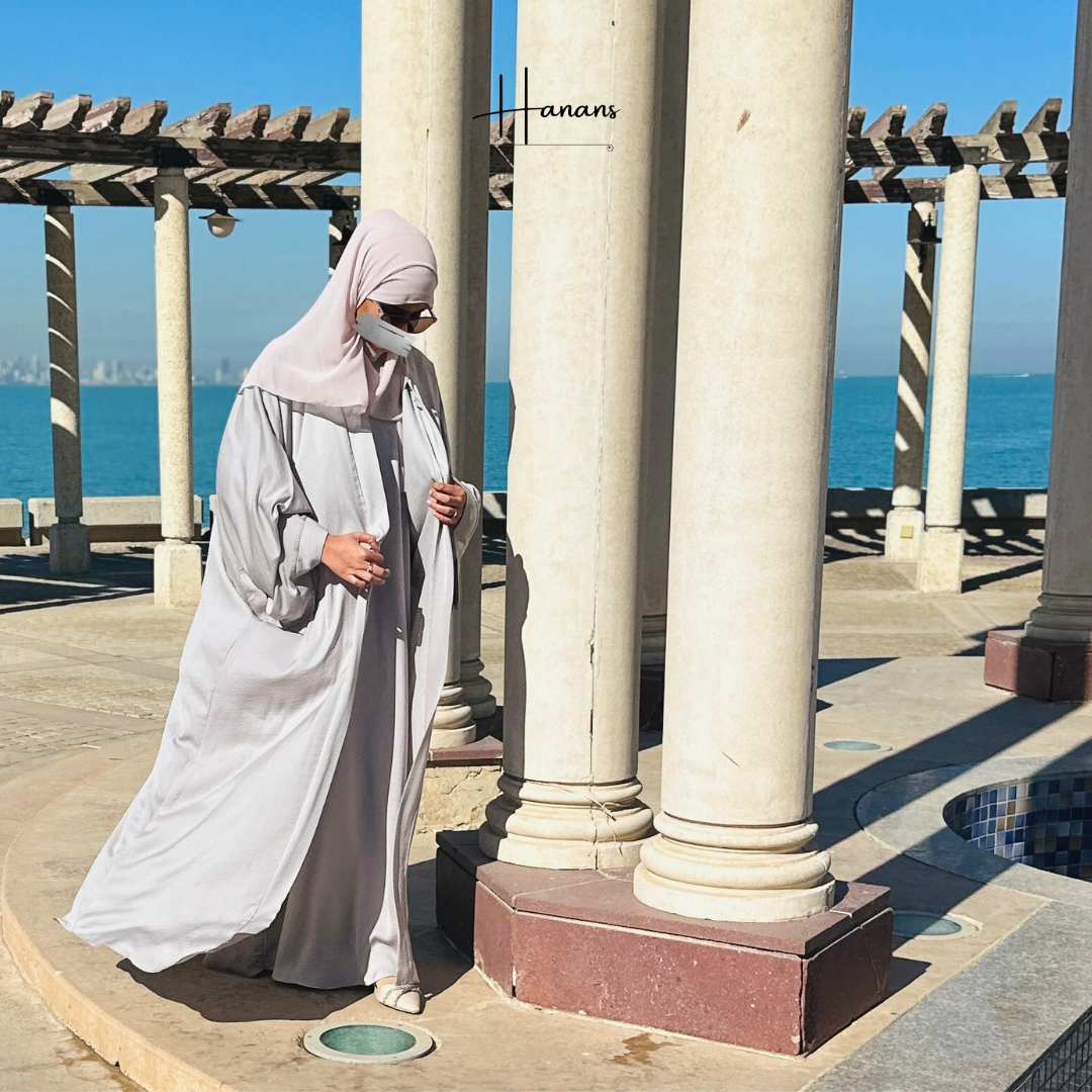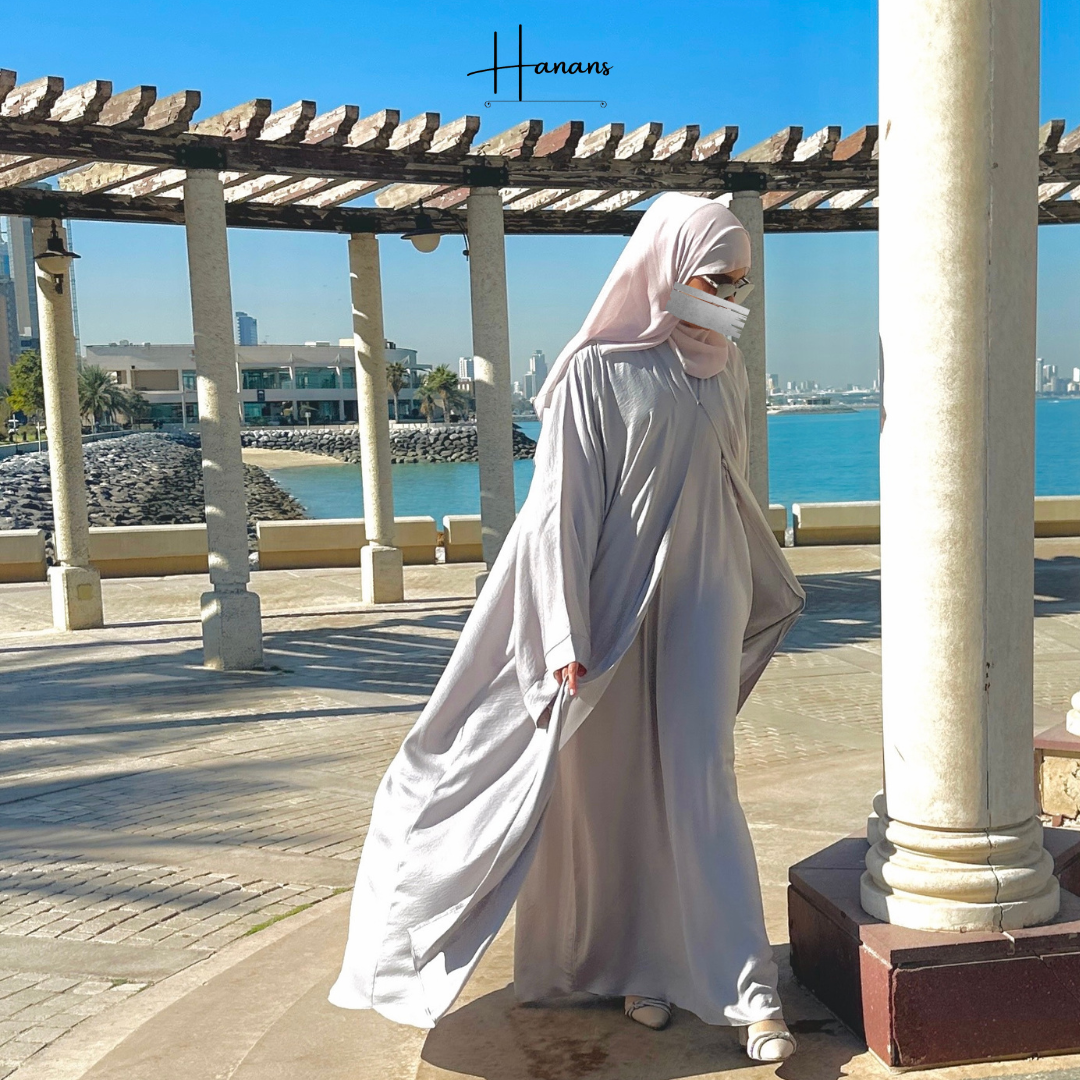 This elegant 2-piece silver abaya is a versatile and stylish addition to your wardrobe, designed with comfort and sophistication in mind.