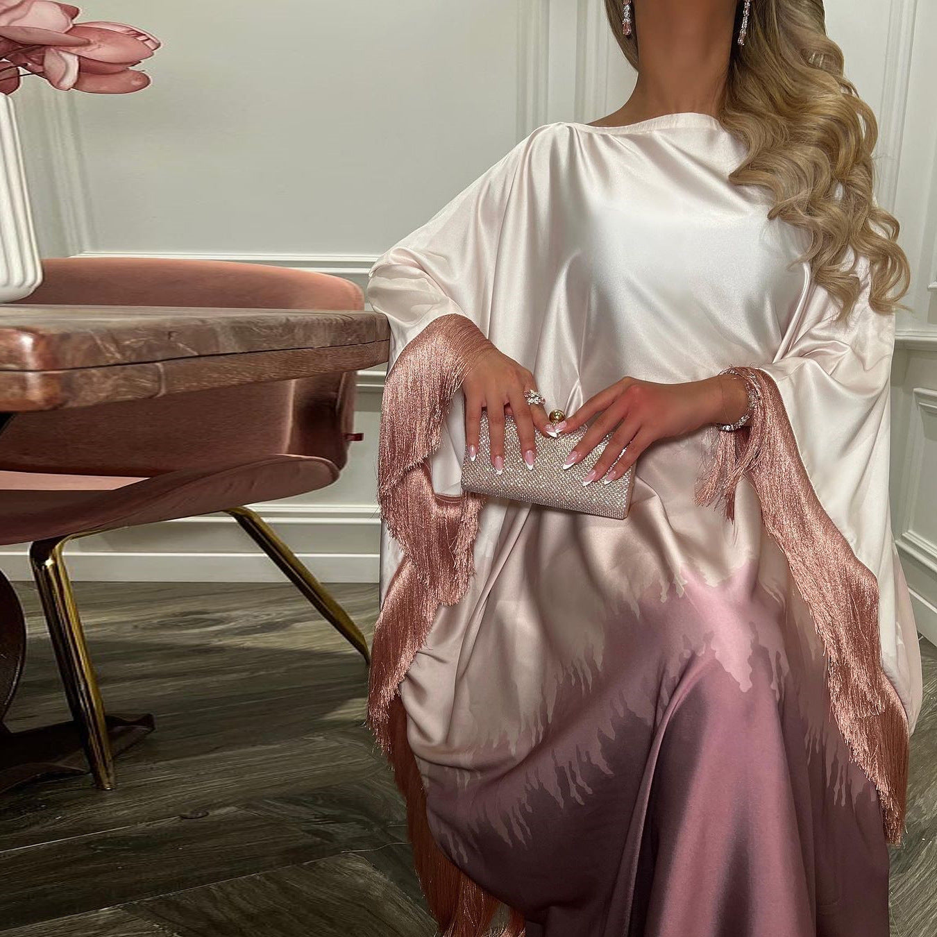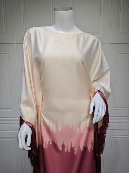 Indulge in luxury with our Ombre Fringed Kaftan, a timeless piece designed for elegance and sophistication. Crafted from premium silk-satin fabric, this kaftan drapes effortlessly, offering a flowing and graceful silhouette. The ombre gradient at the hem creates a mesmerizing effect, available in two stunning shades: